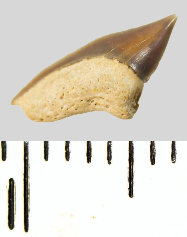 Зуб (фрагмент). Акула. Palaeoanacorax volgensis Glueckman, 1971. Классификация: Хордовые Chordata, Позвоночные Vertebrata, Хрящевые рыбы Chondrichthyes, Пластиножаберные Elasmobranchii, Акулы Selachii, Ламнообразные Lamniformes, Anacoracidae