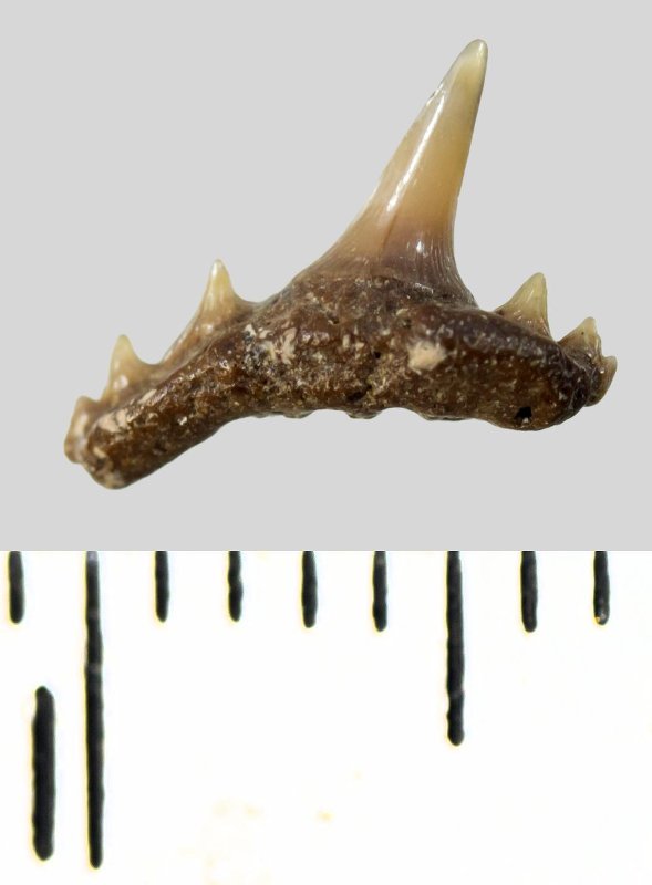 Зуб. Акула. Synechodus dubrisiensis (Mackie, 1863). Классификация: Хордовые Chordata, Позвоночные Vertebrata, Хрящевые рыбы Chondrichthyes, Пластиножаберные Elasmobranchii, Акулы Selachii, Синеходонтообразные Synechodontiformes