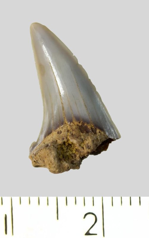 Зуб (фрагмент). Акула. Cretoxyrhina denticulata (Glueckman, 1957). Классификация: Хордовые Chordata, Позвоночные Vertebrata, Хрящевые рыбы Chondrichthyes, Пластиножаберные Elasmobranchii, Акулы Selachii, Ламнообразные Lamniformes