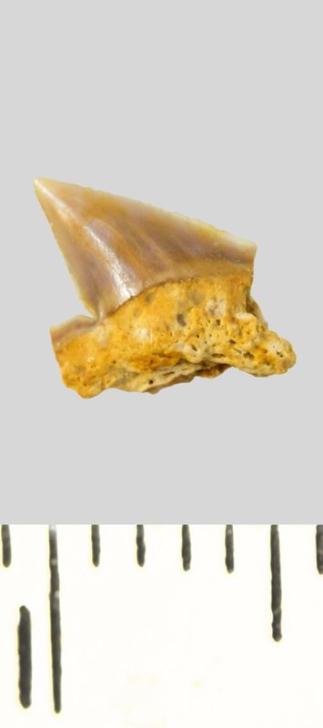 Зуб (фрагмент). Акула. Corax heterodon (Reuss, 1845). Классификация: Хордовые Chordata, Позвоночные Vertebrata, Хрящевые рыбы Chondrichthyes, Пластиножаберные Elasmobranchii, Акулы Selachii, Ламнообразные Lamniformes