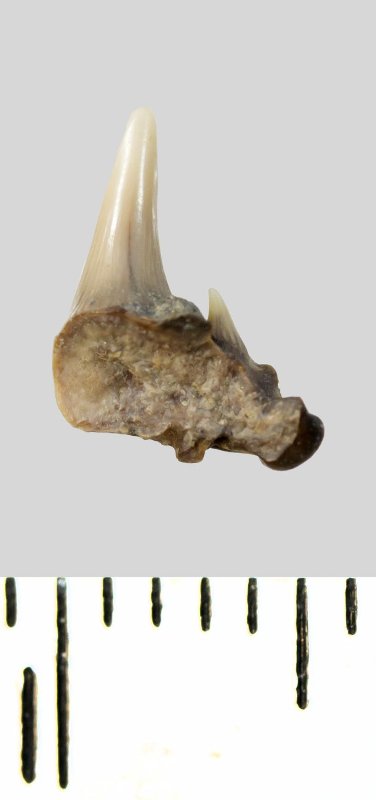 Зуб (фрагмент). Акула. Hybodus dispar (Reuss, 1845). Классификация: Хордовые Chordata, Позвоночные Vertebrata, Хрящевые рыбы Chondrichthyes, Пластиножаберные Elasmobranchii, Акулы Selachii, Синеходонтообразные Synechodontiformes