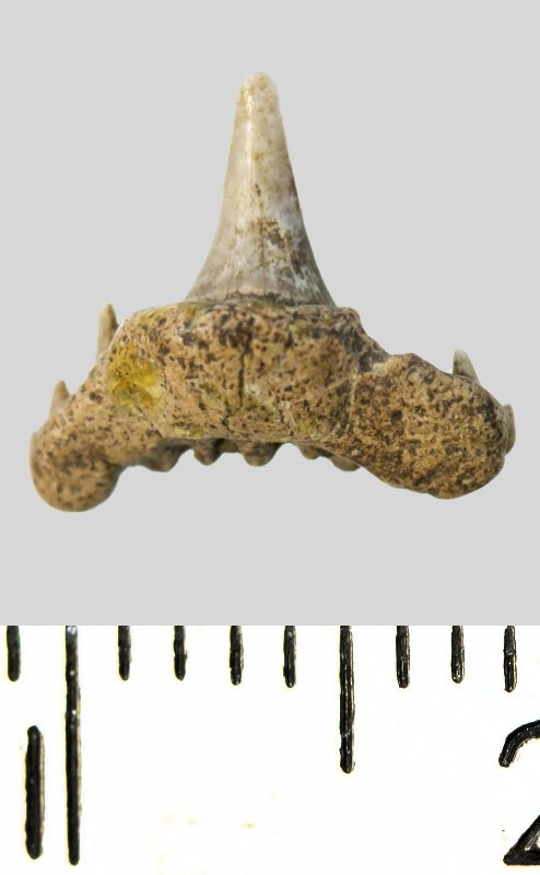 Зуб. Акула. Hybodus dispar (Reuss, 1845). Классификация: Хордовые Chordata, Позвоночные Vertebrata, Хрящевые рыбы Chondrichthyes, Пластиножаберные Elasmobranchii, Акулы Selachii, Синеходонтообразные Synechodontiformes