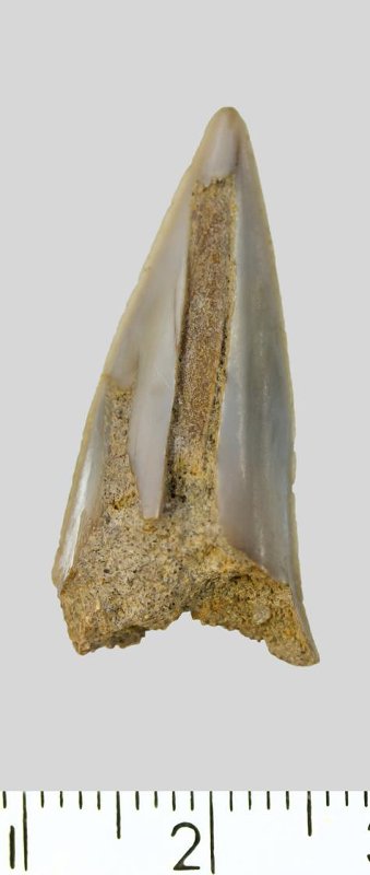 Зуб (фрагмент). Акула. Pseudoisurus tomosus Glueckman, 1957. Классификация: Хордовые Chordata, Позвоночные Vertebrata, Хрящевые рыбы Chondrichthyes, Пластиножаберные Elasmobranchii, Акулы Selachii, Ламнообразные Lamniformes