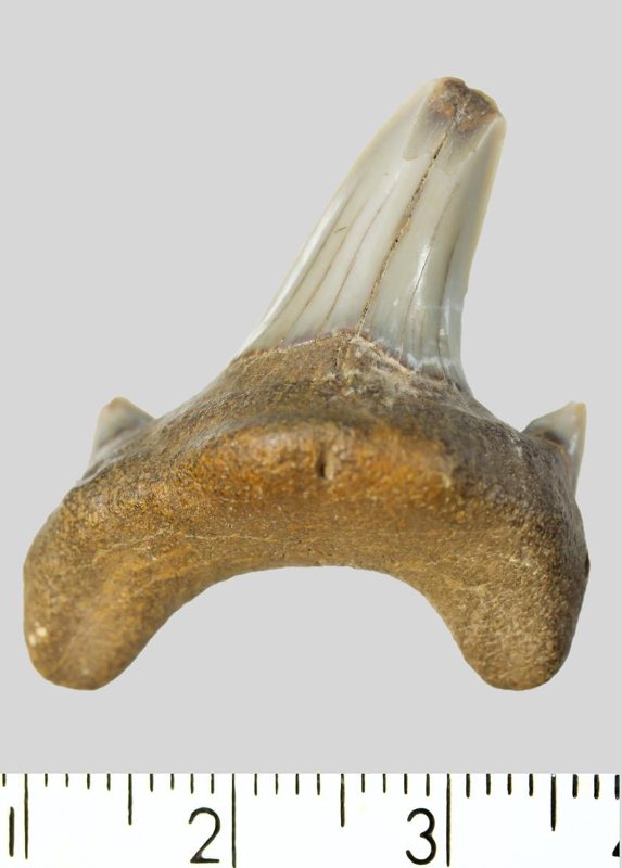 Зуб. Акула. Pseudoisurus tomosus Glueckman, 1957. Классификация: Хордовые Chordata, Позвоночные Vertebrata, Хрящевые рыбы Chondrichthyes, Пластиножаберные Elasmobranchii, Акулы Selachii, Ламнообразные Lamniformes