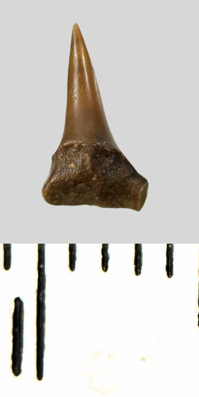 Зуб (фрагмент). Акула. Synechodus dubrisiensis (Mackie, 1863). Классификация: Хордовые Chordata, Позвоночные Vertebrata, Хрящевые рыбы Chondrichthyes, Пластиножаберные Elasmobranchii, Акулы Selachii, Синеходонтообразные Synechodontiformes