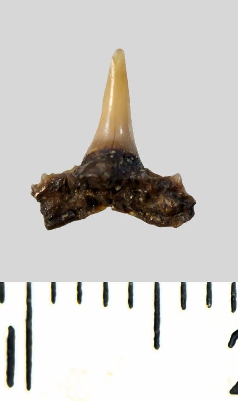 Зуб (фрагмент). Акула. Synechodus dubrisiensis (Mackie, 1863). Классификация: Хордовые Chordata, Позвоночные Vertebrata, Хрящевые рыбы Chondrichthyes, Пластиножаберные Elasmobranchii, Акулы Selachii, Синеходонтообразные Synechodontiformes