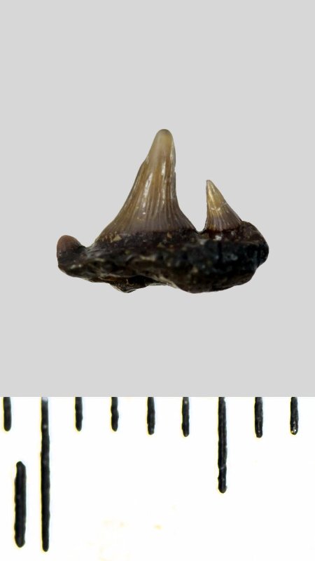 Зуб (фрагмент). Акула. Synechodus dubrisiensis (Mackie, 1863). Классификация: Хордовые Chordata, Позвоночные Vertebrata, Хрящевые рыбы Chondrichthyes, Пластиножаберные Elasmobranchii, Акулы Selachii, Синеходонтообразные Synechodontiformes