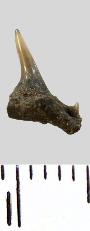 Зуб. Акула. Synechodus dubrisiensis (Mackie, 1863). Классификация: Хордовые Chordata, Позвоночные Vertebrata, Хрящевые рыбы Chondrichthyes, Пластиножаберные Elasmobranchii, Акулы Selachii, Синеходонтообразные Synechodontiformes