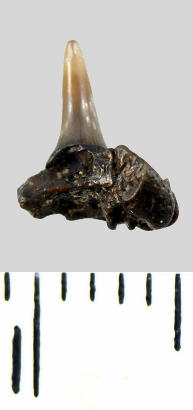 Зуб. Акула. Synechodus dubrisiensis (Mackie, 1863). Классификация: Хордовые Chordata, Позвоночные Vertebrata, Хрящевые рыбы Chondrichthyes, Пластиножаберные Elasmobranchii, Акулы Selachii, Синеходонтообразные Synechodontiformes