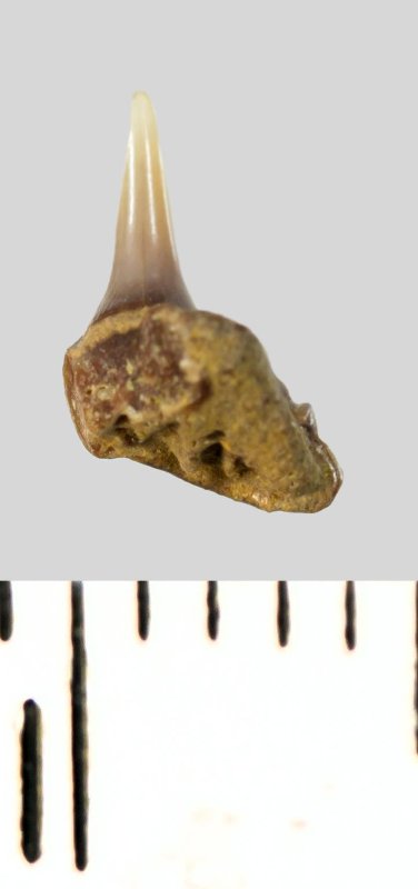 Зуб. Акула. Synechodus dubrisiensis (Mackie, 1863). Классификация: Хордовые Chordata, Позвоночные Vertebrata, Хрящевые рыбы Chondrichthyes, Пластиножаберные Elasmobranchii, Акулы Selachii, Синеходонтообразные Synechodontiformes