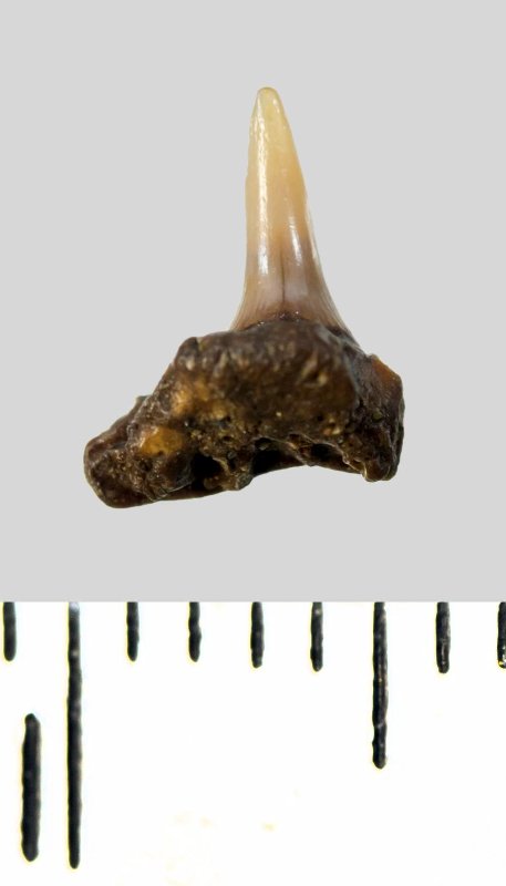 Зуб. Акула. Synechodus dubrisiensis (Mackie, 1863). Классификация: Хордовые Chordata, Позвоночные Vertebrata, Хрящевые рыбы Chondrichthyes, Пластиножаберные Elasmobranchii, Акулы Selachii, Синеходонтообразные Synechodontiformes