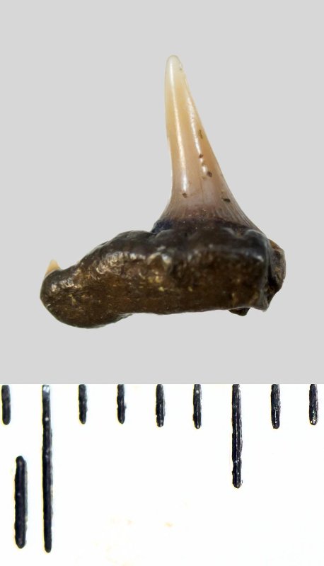 Зуб. Акула. Synechodus dubrisiensis (Mackie, 1863). Классификация: Хордовые Chordata, Позвоночные Vertebrata, Хрящевые рыбы Chondrichthyes, Пластиножаберные Elasmobranchii, Акулы Selachii, Синеходонтообразные Synechodontiformes