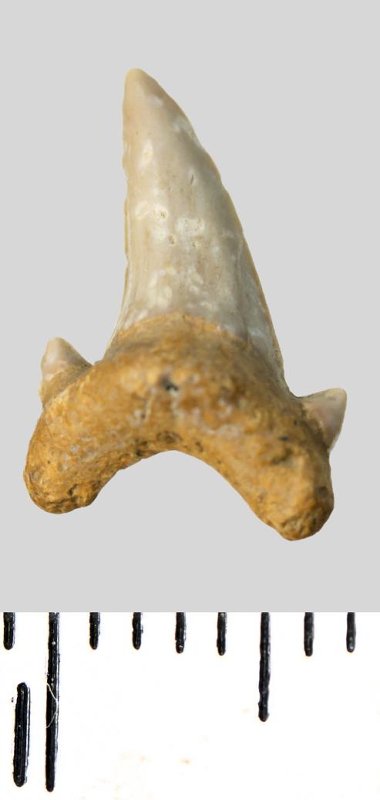 Зуб. Акула. Archaeolamna cf. kopingensis (Davis, 1890). Классификация: Хордовые Chordata, Позвоночные Vertebrata, Хрящевые рыбы Chondrichthyes, Пластиножаберные Elasmobranchii, Акулы Selachii, Ламнообразные Lamniformes