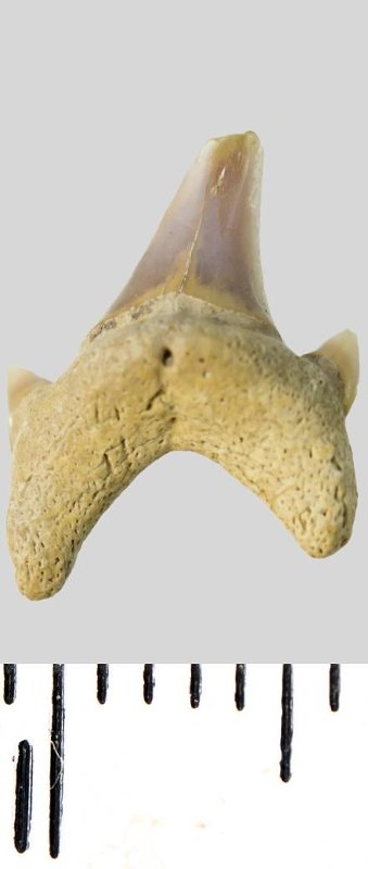 Зуб. Акула. Archaeolamna cf. kopingensis (Davis, 1890). Классификация: Хордовые Chordata, Позвоночные Vertebrata, Хрящевые рыбы Chondrichthyes, Пластиножаберные Elasmobranchii, Акулы Selachii, Ламнообразные Lamniformes