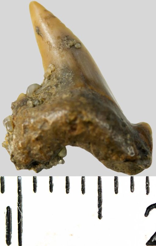 Зуб. Акула. Archaeolamna cf. kopingensis (Davis, 1890). Классификация: Хордовые Chordata, Позвоночные Vertebrata, Хрящевые рыбы Chondrichthyes, Пластиножаберные Elasmobranchii, Акулы Selachii, Ламнообразные Lamniformes