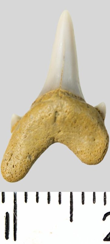 Зуб. Акула. Archaeolamna cf. kopingensis (Davis, 1890). Классификация: Хордовые Chordata, Позвоночные Vertebrata, Хрящевые рыбы Chondrichthyes, Пластиножаберные Elasmobranchii, Акулы Selachii, Ламнообразные Lamniformes