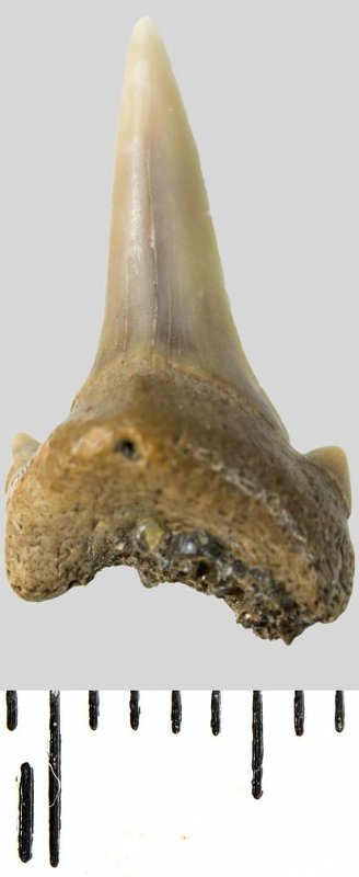 Зуб. Акула. Archaeolamna cf. kopingensis (Davis, 1890). Классификация: Хордовые Chordata, Позвоночные Vertebrata, Хрящевые рыбы Chondrichthyes, Пластиножаберные Elasmobranchii, Акулы Selachii, Ламнообразные Lamniformes