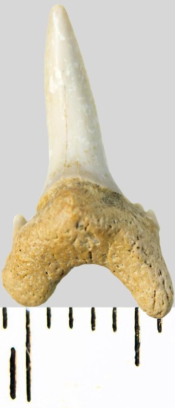 Зуб. Акула. Archaeolamna cf. kopingensis (Davis, 1890). Классификация: Хордовые Chordata, Позвоночные Vertebrata, Хрящевые рыбы Chondrichthyes, Пластиножаберные Elasmobranchii, Акулы Selachii, Ламнообразные Lamniformes