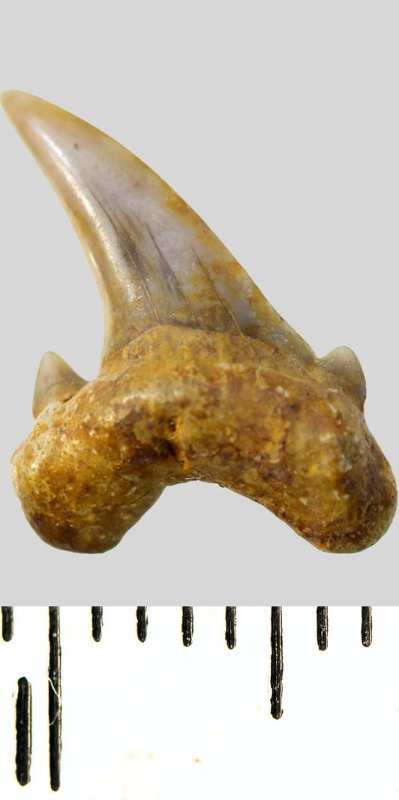 Зуб. Акула. Archaeolamna cf. kopingensis (Davis, 1890). Классификация: Хордовые Chordata, Позвоночные Vertebrata, Хрящевые рыбы Chondrichthyes, Пластиножаберные Elasmobranchii, Акулы Selachii, Ламнообразные Lamniformes