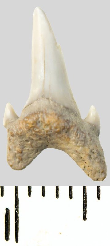 Зуб. Акула. Archaeolamna cf. kopingensis (Davis, 1890). Классификация: Хордовые Chordata, Позвоночные Vertebrata, Хрящевые рыбы Chondrichthyes, Пластиножаберные Elasmobranchii, Акулы Selachii, Ламнообразные Lamniformes