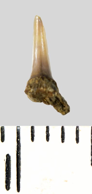 Зуб (фрагмент). Акула. Eostriatolamia subulata (Agassiz, 1843). Классификация: Хордовые Chordata, Позвоночные Vertebrata, Хрящевые рыбы Chondrichthyes, Пластиножаберные Elasmobranchii, Акулы Selachii, Ламнообразные Lamniformes