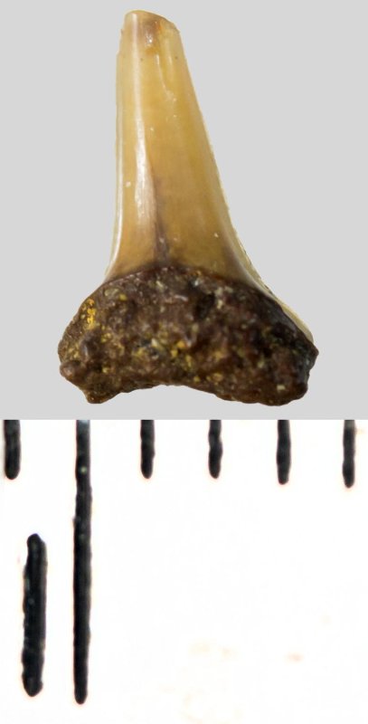 Зуб (фрагмент). Акула. Eostriatolamia subulata (Agassiz, 1843). Классификация: Хордовые Chordata, Позвоночные Vertebrata, Хрящевые рыбы Chondrichthyes, Пластиножаберные Elasmobranchii, Акулы Selachii, Ламнообразные Lamniformes