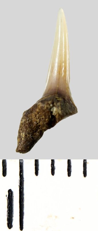 Зуб. Акула. Eostriatolamia subulata (Agassiz, 1843). Классификация: Хордовые Chordata, Позвоночные Vertebrata, Хрящевые рыбы Chondrichthyes, Пластиножаберные Elasmobranchii, Акулы Selachii, Ламнообразные Lamniformes