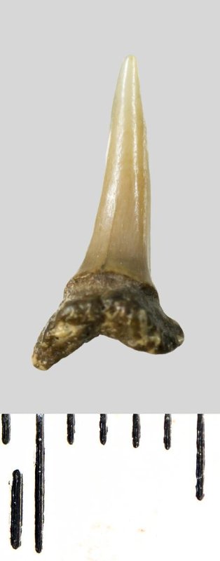 Зуб. Акула. Eostriatolamia subulata (Agassiz, 1843). Классификация: Хордовые Chordata, Позвоночные Vertebrata, Хрящевые рыбы Chondrichthyes, Пластиножаберные Elasmobranchii, Акулы Selachii, Ламнообразные Lamniformes