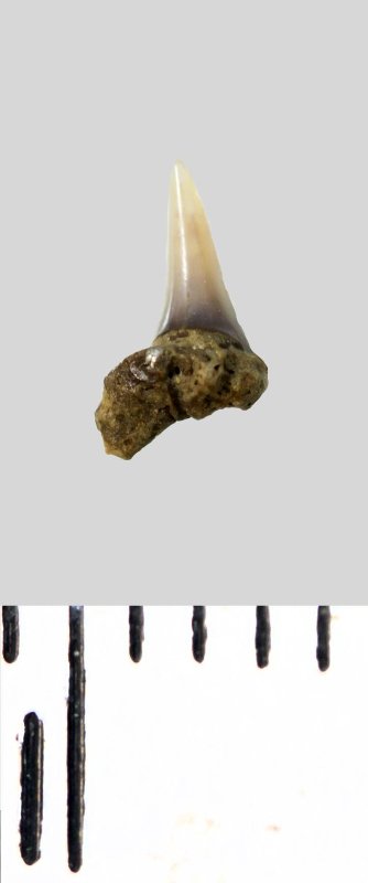 Зуб. Акула. Eostriatolamia subulata (Agassiz, 1843). Классификация: Хордовые Chordata, Позвоночные Vertebrata, Хрящевые рыбы Chondrichthyes, Пластиножаберные Elasmobranchii, Акулы Selachii, Ламнообразные Lamniformes