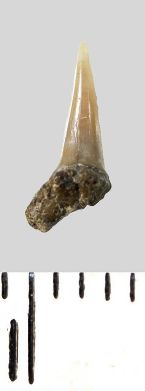 Зуб. Акула. Eostriatolamia subulata (Agassiz, 1843). Классификация: Хордовые Chordata, Позвоночные Vertebrata, Хрящевые рыбы Chondrichthyes, Пластиножаберные Elasmobranchii, Акулы Selachii, Ламнообразные Lamniformes