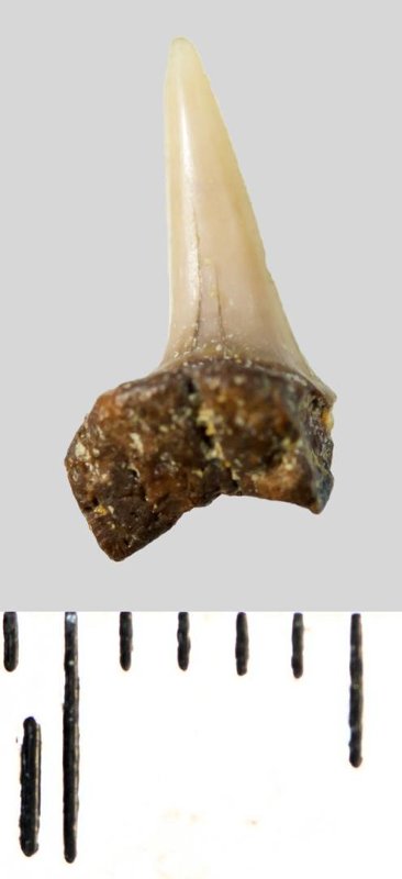 Зуб. Акула. Eostriatolamia subulata (Agassiz, 1843). Классификация: Хордовые Chordata, Позвоночные Vertebrata, Хрящевые рыбы Chondrichthyes, Пластиножаберные Elasmobranchii, Акулы Selachii, Ламнообразные Lamniformes