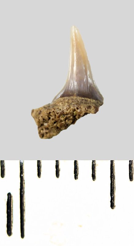 Зуб. Акула. Eostriatolamia subulata (Agassiz, 1843). Классификация: Хордовые Chordata, Позвоночные Vertebrata, Хрящевые рыбы Chondrichthyes, Пластиножаберные Elasmobranchii, Акулы Selachii, Ламнообразные Lamniformes