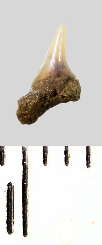 Зуб. Акула. Eostriatolamia subulata (Agassiz, 1843). Классификация: Хордовые Chordata, Позвоночные Vertebrata, Хрящевые рыбы Chondrichthyes, Пластиножаберные Elasmobranchii, Акулы Selachii, Ламнообразные Lamniformes