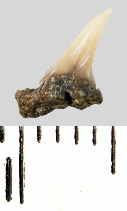Зуб. Акула. Eostriatolamia subulata (Agassiz, 1843). Классификация: Хордовые Chordata, Позвоночные Vertebrata, Хрящевые рыбы Chondrichthyes, Пластиножаберные Elasmobranchii, Акулы Selachii, Ламнообразные Lamniformes