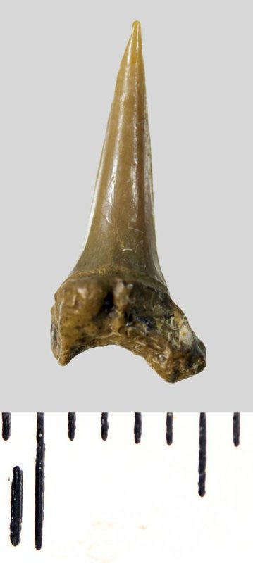 Зуб. Акула. Eostriatolamia subulata (Agassiz, 1843). Классификация: Хордовые Chordata, Позвоночные Vertebrata, Хрящевые рыбы Chondrichthyes, Пластиножаберные Elasmobranchii, Акулы Selachii, Ламнообразные Lamniformes