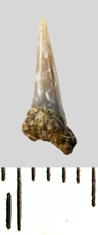Зуб. Акула. Eostriatolamia subulata (Agassiz, 1843). Классификация: Хордовые Chordata, Позвоночные Vertebrata, Хрящевые рыбы Chondrichthyes, Пластиножаберные Elasmobranchii, Акулы Selachii, Ламнообразные Lamniformes