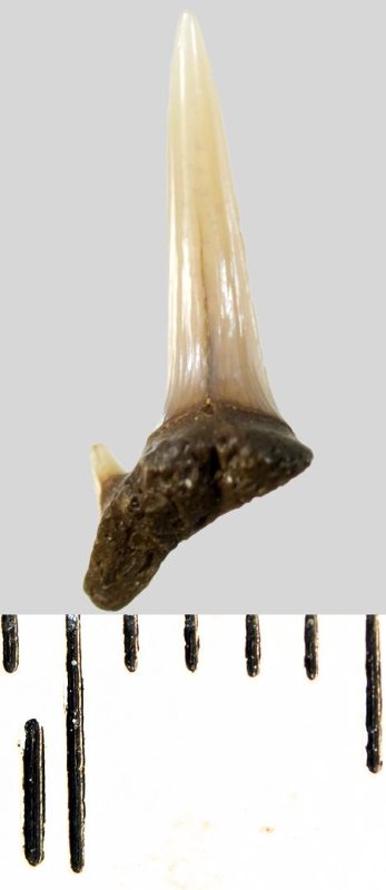 Зуб. Акула. Eostriatolamia subulata (Agassiz, 1843). Классификация: Хордовые Chordata, Позвоночные Vertebrata, Хрящевые рыбы Chondrichthyes, Пластиножаберные Elasmobranchii, Акулы Selachii, Ламнообразные Lamniformes