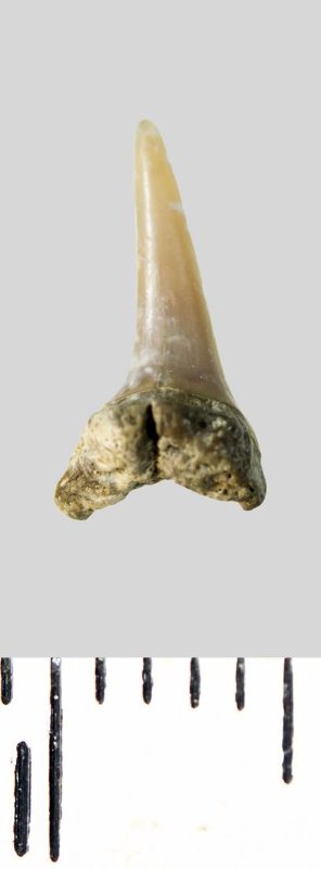 Зуб. Акула. Eostriatolamia subulata (Agassiz, 1843). Классификация: Хордовые Chordata, Позвоночные Vertebrata, Хрящевые рыбы Chondrichthyes, Пластиножаберные Elasmobranchii, Акулы Selachii, Ламнообразные Lamniformes