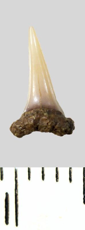 Зуб. Акула. Eostriatolamia subulata (Agassiz, 1843). Классификация: Хордовые Chordata, Позвоночные Vertebrata, Хрящевые рыбы Chondrichthyes, Пластиножаберные Elasmobranchii, Акулы Selachii, Ламнообразные Lamniformes