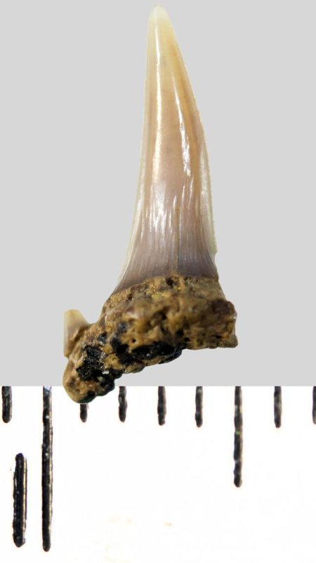 Зуб. Акула. Eostriatolamia subulata (Agassiz, 1843). Классификация: Хордовые Chordata, Позвоночные Vertebrata, Хрящевые рыбы Chondrichthyes, Пластиножаберные Elasmobranchii, Акулы Selachii, Ламнообразные Lamniformes