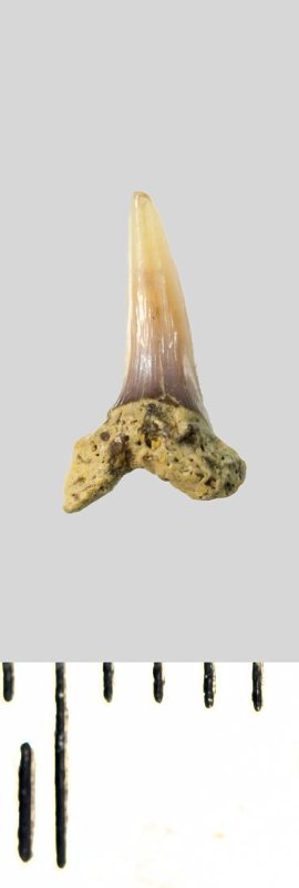 Зуб. Акула. Eostriatolamia subulata (Agassiz, 1843). Классификация: Хордовые Chordata, Позвоночные Vertebrata, Хрящевые рыбы Chondrichthyes, Пластиножаберные Elasmobranchii, Акулы Selachii, Ламнообразные Lamniformes