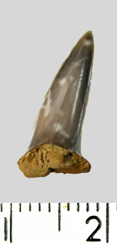 Зуб (фрагмент). Акула. Lamniformes gen. et sp. indet. Классификация: Хордовые Chordata, Позвоночные Vertebrata, Хрящевые рыбы Chondrichthyes, Пластиножаберные Elasmobranchii