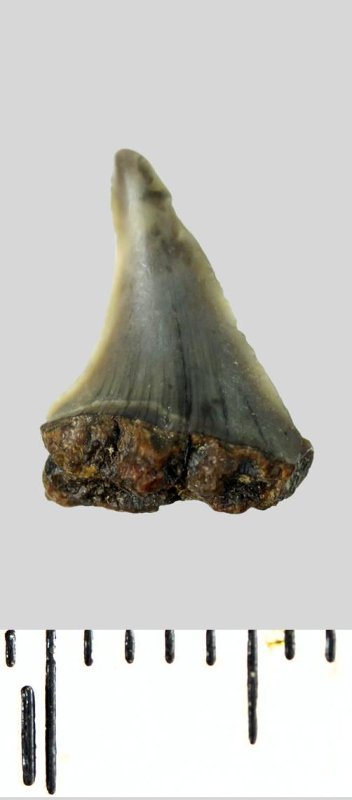 Зуб (фрагмент). Акула. Lamniformes gen. et sp. indet. Классификация: Хордовые Chordata, Позвоночные Vertebrata, Хрящевые рыбы Chondrichthyes, Пластиножаберные Elasmobranchii