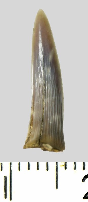 Зуб (фрагмент). Акула. Striatolamia teretidens (White, 1931). Классификация: Хордовые Chordata, Позвоночные Vertebrata, Хрящевые рыбы Chondrichthyes, Пластиножаберные Elasmobranchii