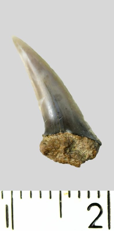 Зуб (фрагмент). Акула. Striatolamia teretidens (White, 1931). Классификация: Хордовые Chordata, Позвоночные Vertebrata, Хрящевые рыбы Chondrichthyes, Пластиножаберные Elasmobranchii