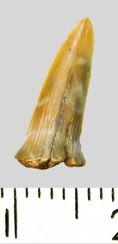 Зуб (фрагмент). Акула. Striatolamia macrota (Agassiz, 1843). Классификация: Хордовые Chordata, Позвоночные Vertebrata, Хрящевые рыбы Chondrichthyes, Пластиножаберные Elasmobranchii
