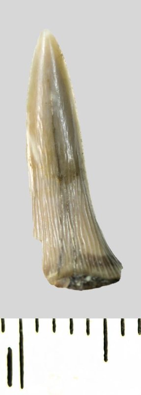 Зуб (фрагмент). Акула. Striatolamia macrota (Agassiz, 1843). Классификация: Хордовые Chordata, Позвоночные Vertebrata, Хрящевые рыбы Chondrichthyes, Пластиножаберные Elasmobranchii