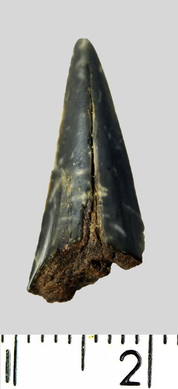 Зуб (фрагмент). Акула. Striatolamia macrota (Agassiz, 1843). Классификация: Хордовые Chordata, Позвоночные Vertebrata, Хрящевые рыбы Chondrichthyes, Пластиножаберные Elasmobranchii