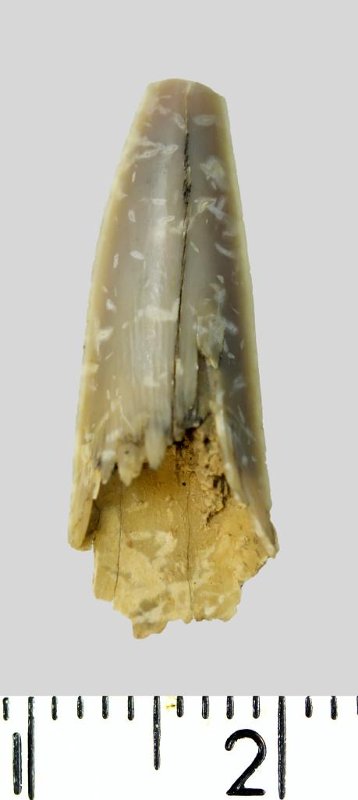 Зуб (фрагмент). Акула. Striatolamia macrota (Agassiz, 1843). Классификация: Хордовые Chordata, Позвоночные Vertebrata, Хрящевые рыбы Chondrichthyes, Пластиножаберные Elasmobranchii