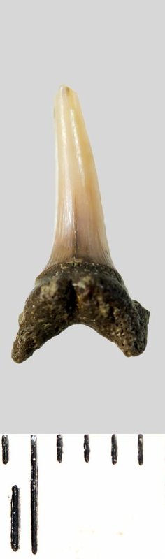Зуб. Акула. Eostriatolamia subulata (Agassiz, 1843). Классификация: Хордовые Chordata, Позвоночные Vertebrata, Хрящевые рыбы Chondrichthyes, Пластиножаберные Elasmobranchii, Акулы Selachii, Ламнообразные Lamniformes